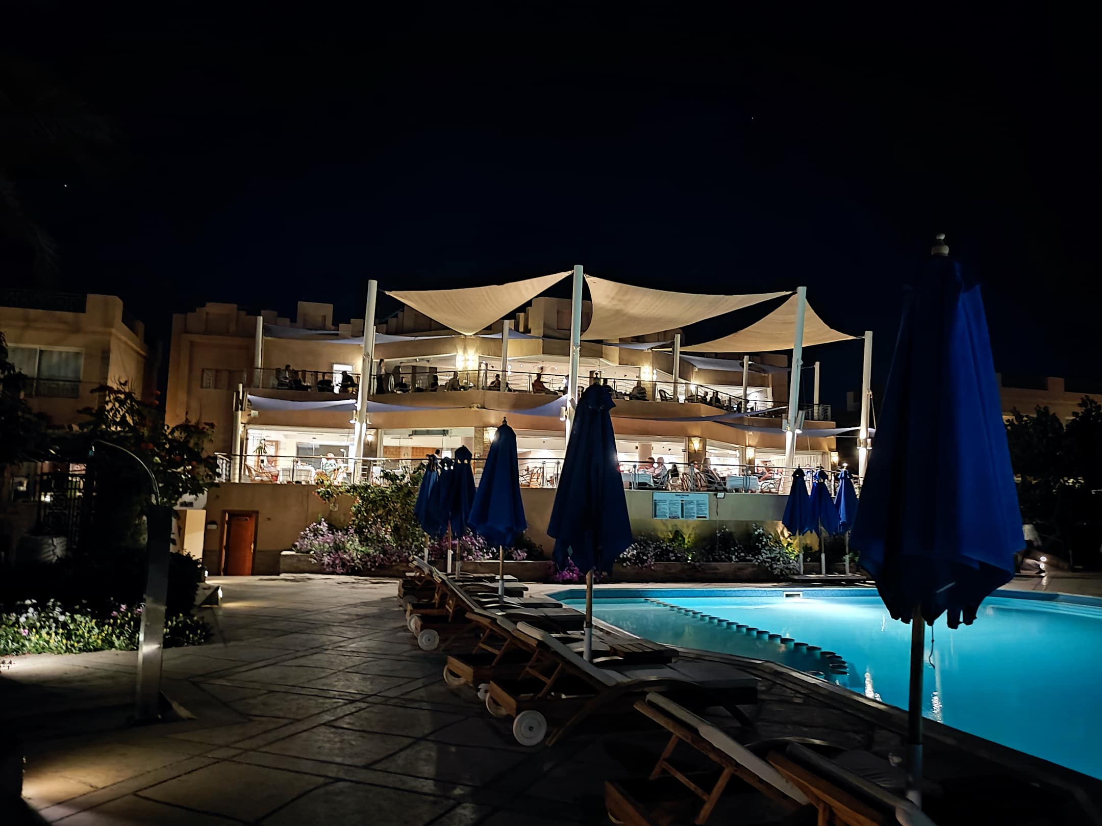 Blick vom Pool zum Restaurant und der Bar am Abend