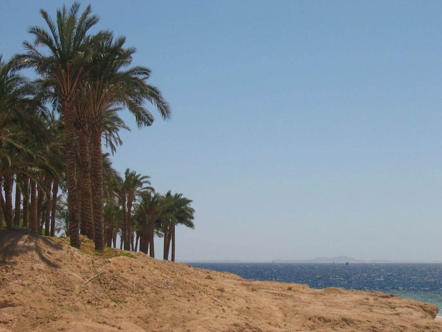 Hier sind wir am Strand entlang links den Weg bis zum Ende gegangen, wo auf einmal viele Palmen auftauchen. Das Bild ist jetzt wieder in Richtung Sheraton aufgenommen. Im Hintergrund kann man die Tiraninsel erkennen.
