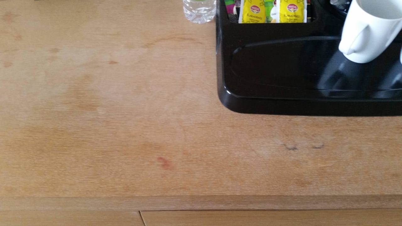 Tisch im Hotelzimmer mit Flecken