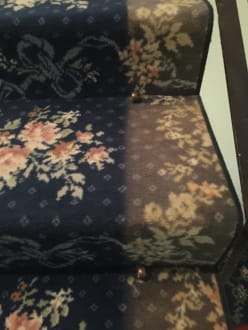 Treppenhaus total verblichener Teppichboden an den Randstreifen unter dem ehemaligen Läufer kommt die ursprüngliche Farbe des Teppichbodens zum Vorschein