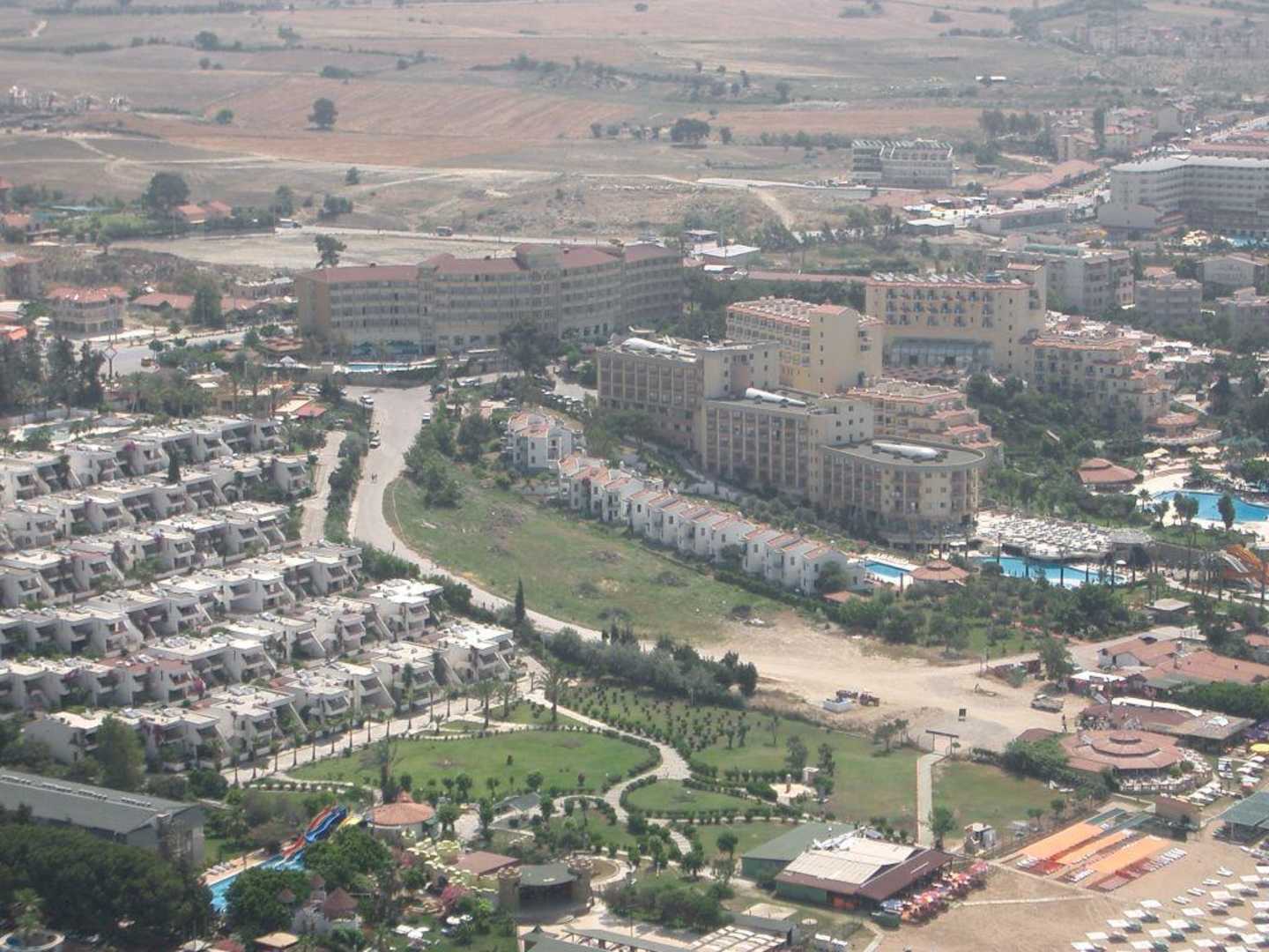 Hotel mit Weg zum StrandIm oberen Teil seht Ihr das Hotel und durch die Mitte des Bildes verläuft der Weg zum Strand vorbei an den weißen Ferienhäusern.