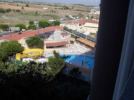 Blick vom Balkon auf Pool und Amphietheater