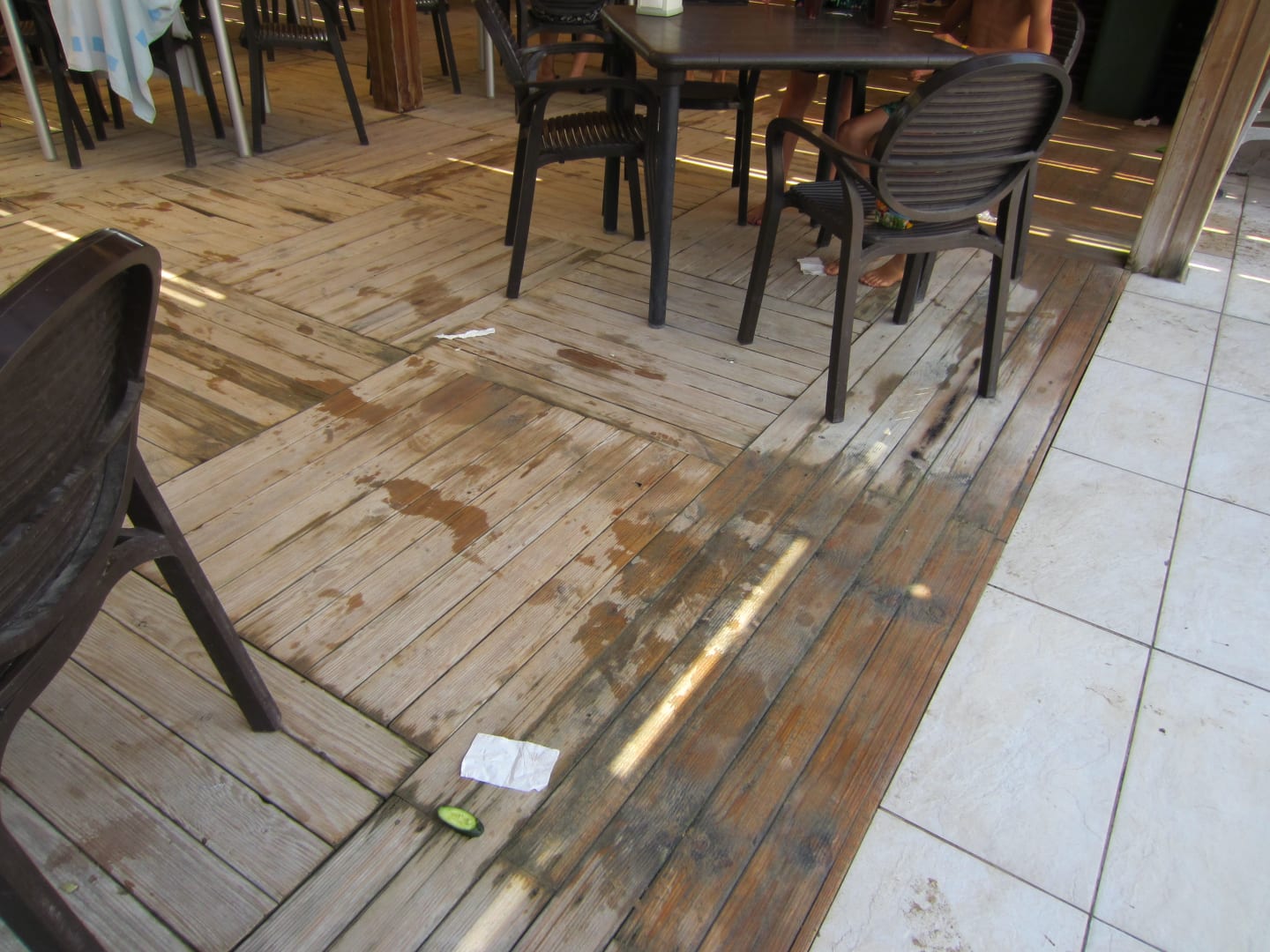 Der Dreck von Tisch wurde einfach runtergefegt Strandrestaurant wie auch im Haupthaus
