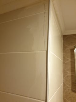 Fliesen kaputt und notdürftig gespachtelt.