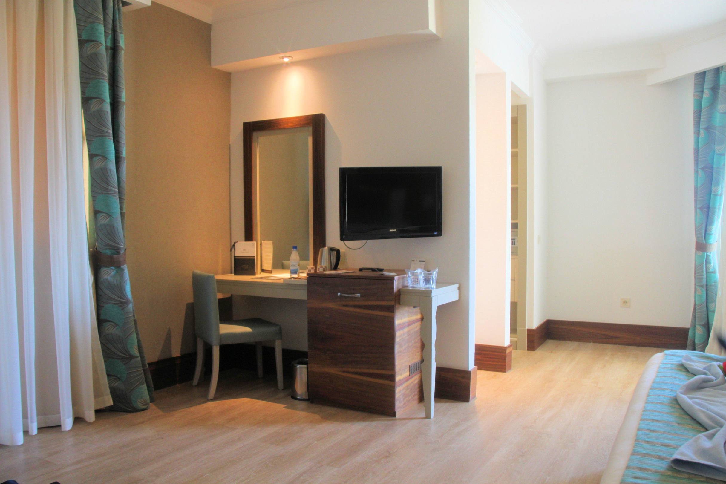 Unser erstes Zimmer, wir sind dann umgezogen, weil wir die Poolseite wollten und hier verlief eine Straße. Hinten links um die Ecke geht es in den begehbaren Kleiderschrank
