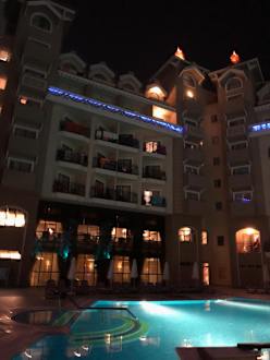 AußenansichtHier der Blick vom Pool zum Hotel. Abends ein wunderschöner Anblick. Als kleiner Tipp: für Familien mit relativ jungen Kindern die eventuell auch noch Mittagsschlaf machen , ist diese Seite nicht empfehlenswert, hier ist es nur nachts leise.