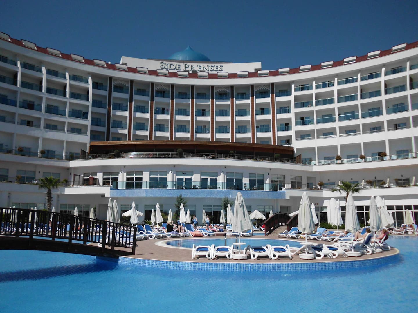 Blick auf die Hauptterrasse (mit braunem Dach) Side Prenses Resort & Spa