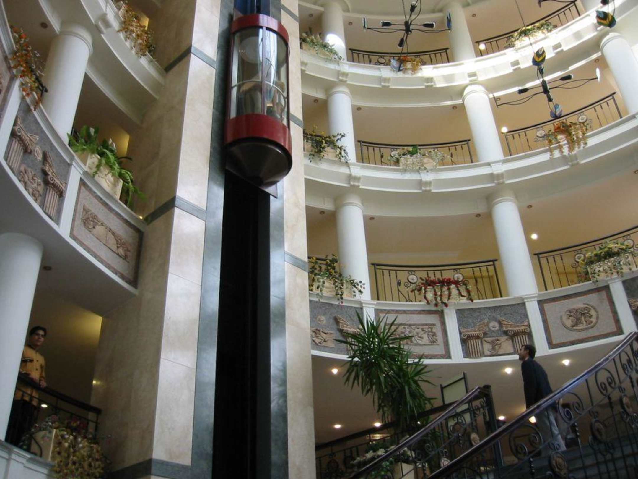 Hübsch anzusehen aber eng und langsam. Das Treppenhaus ist durchaus eine Alternative. Gut beleuchtet, geräumig, recht zentral, nur laufen muss man noch selbst.