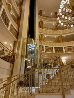 Der Stiegenaufgang zur Bar und zu den Zimmern, Auzüge gibt es natürlich auch zwei