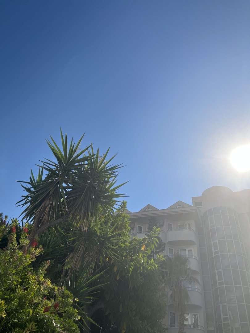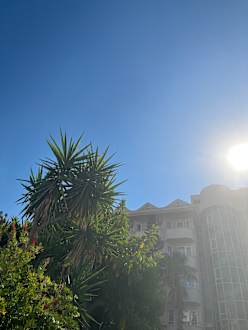 Ausblick in die Höhe vom Liegedtuhl am Pool.