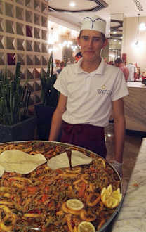 freundlicher Koch (leider ohne Namensschild) an der Paella Pfanne