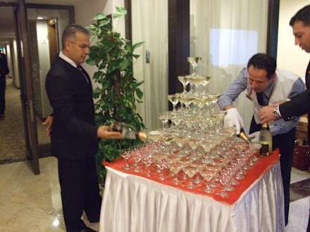 Alle bemühen sich die Gläser zu füllen.