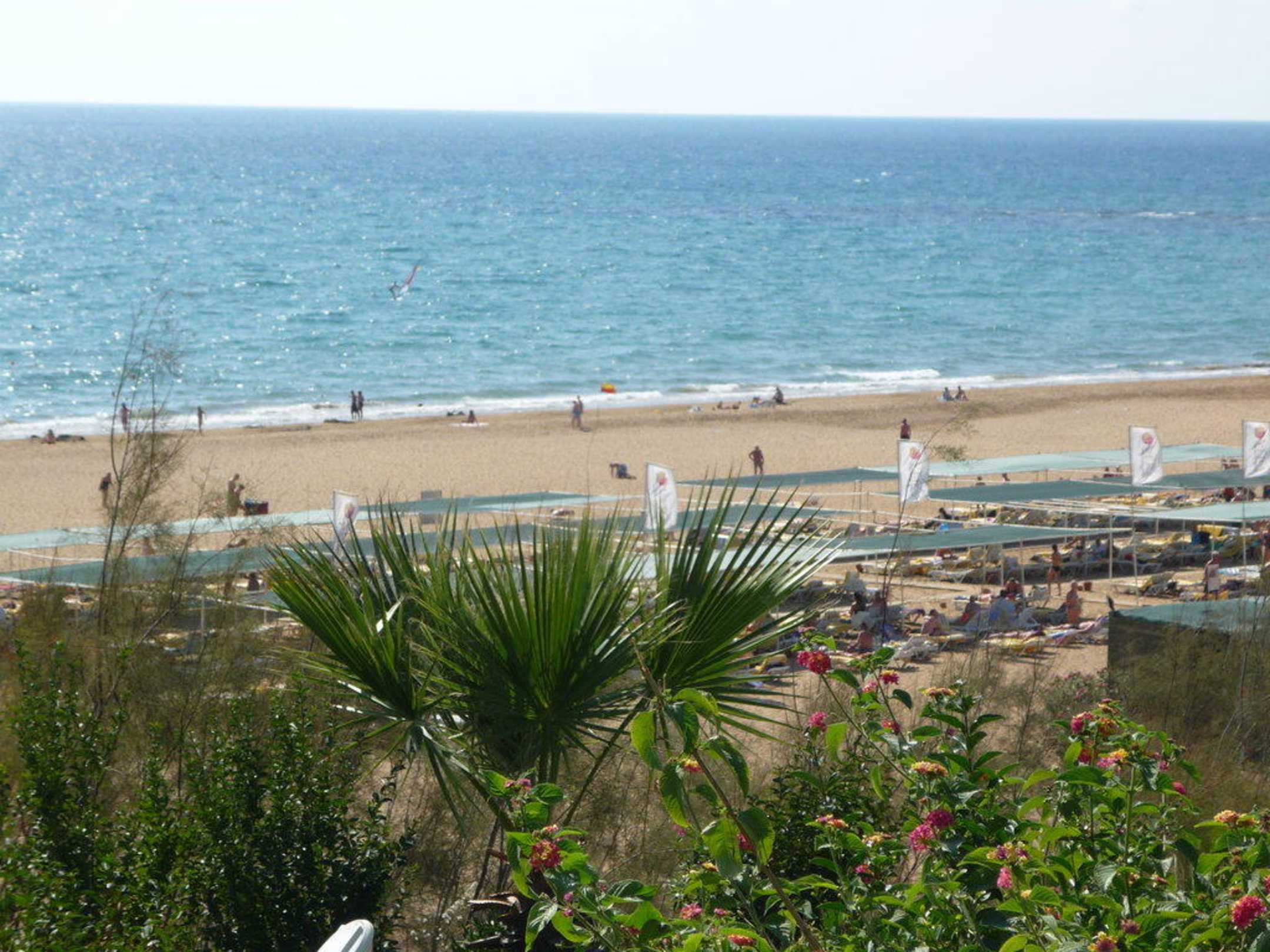 Blick von Gartenanlage auf Strand