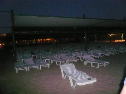 Blick auf die Liegen am Strand spät abends