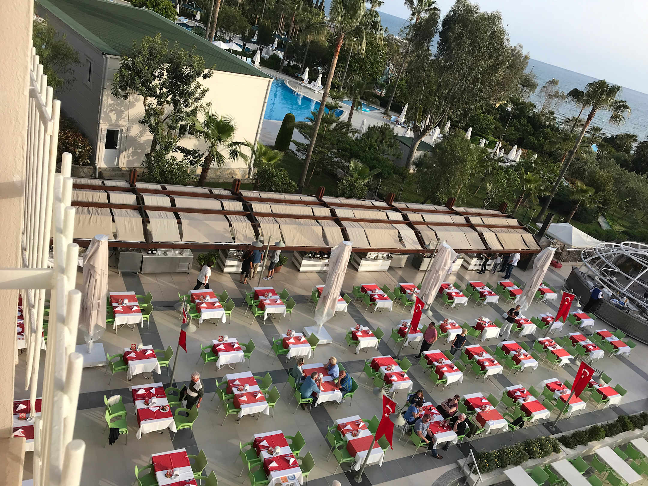 Restaurant-Terrasse am 23.04.2019 , zum Festtag alles rot-weiß