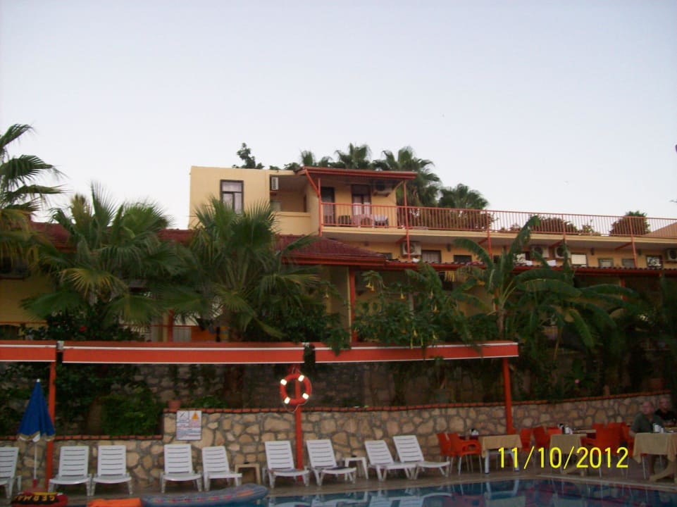 Teil vom Pool mit Blick auf einige Zimmer