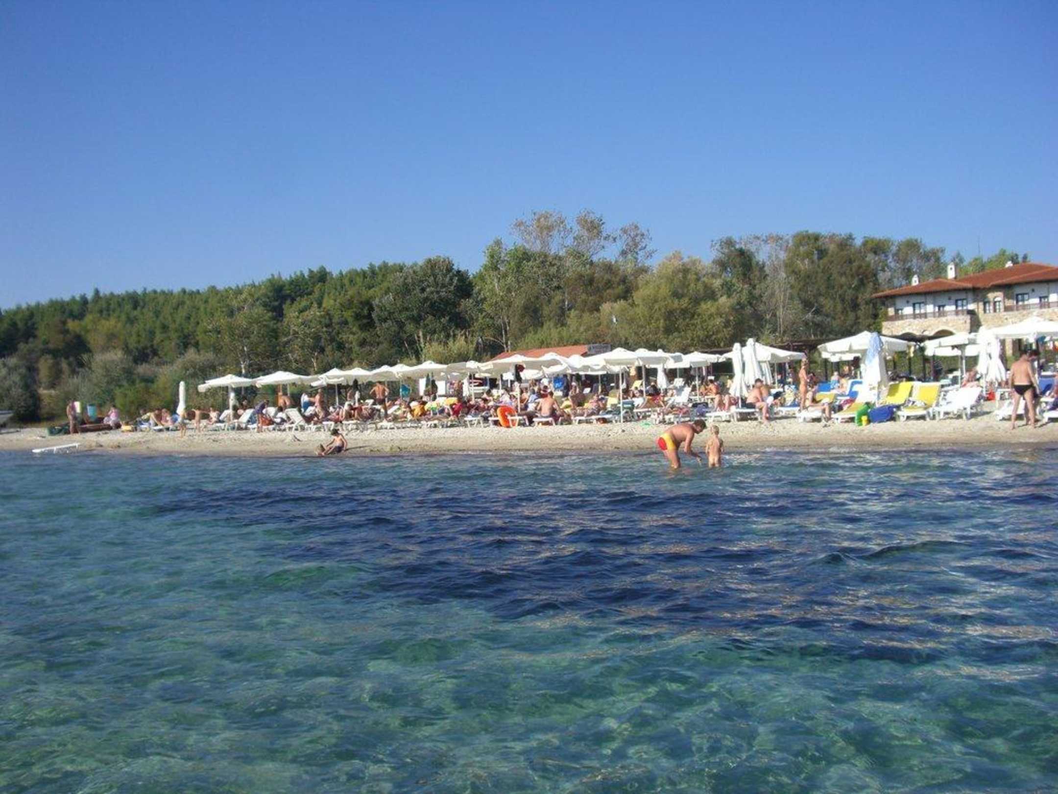 Die weißen Kunststoffliegen da im Bild waren ausreichend vorhanden. Links im Bild bei den Schirmen endet der Hauptstrandabschnitt vom Hotel