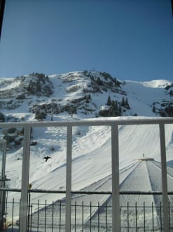 Blick vom Frühstücksraum auf die Piste