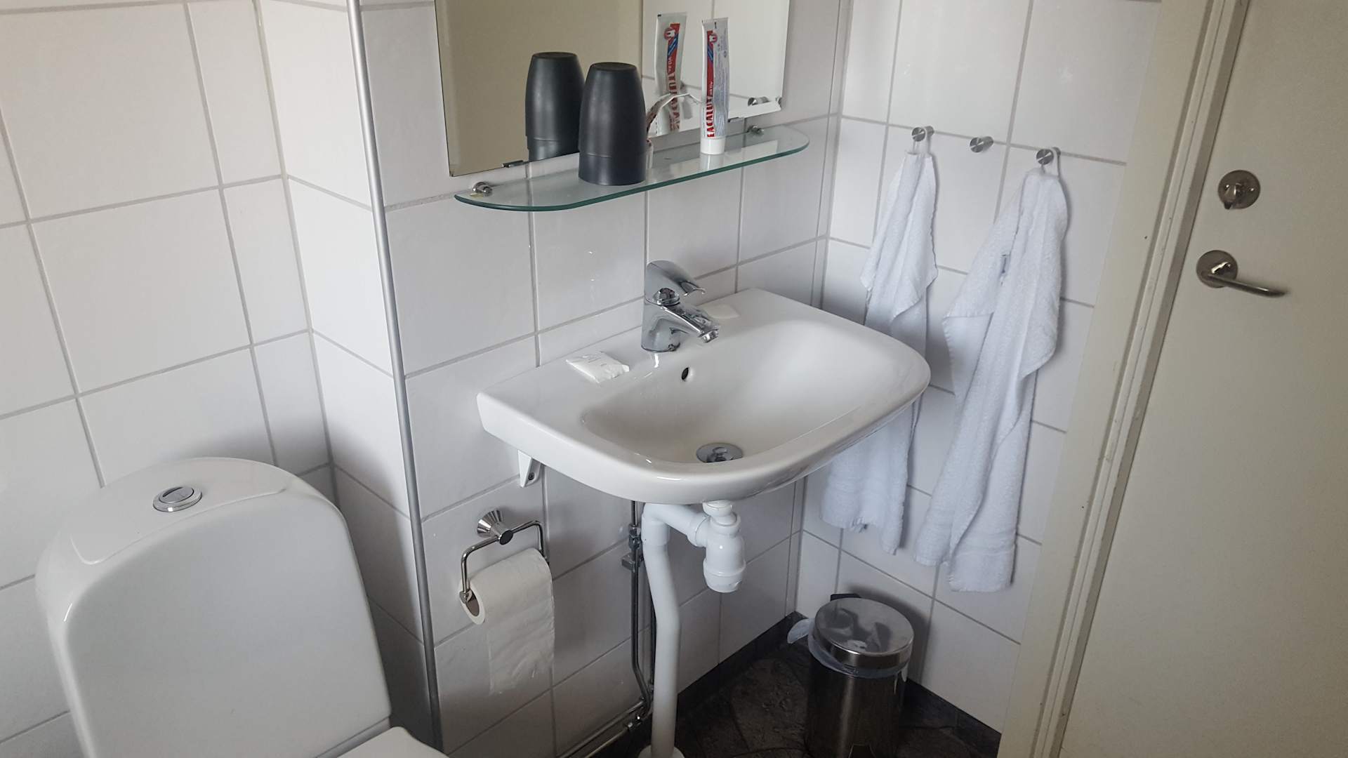 Das Badezimmer war schlicht und klein.