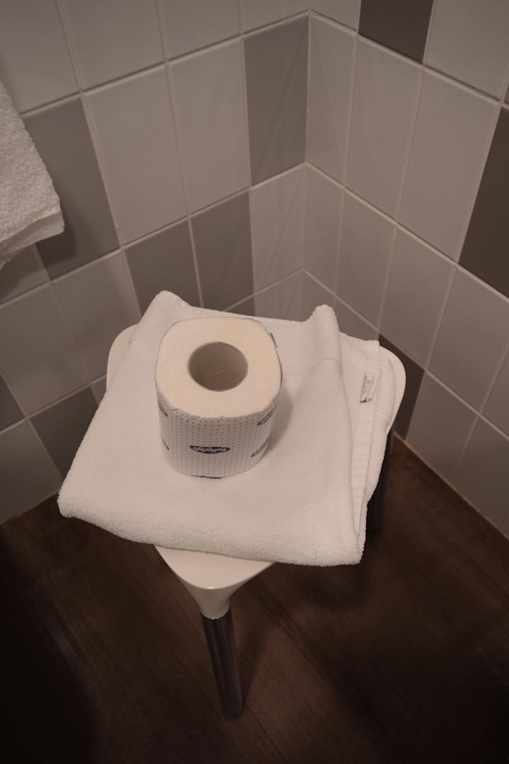 ZimmerStuhl im Badezimmer und zweite Rolle WC-Papier