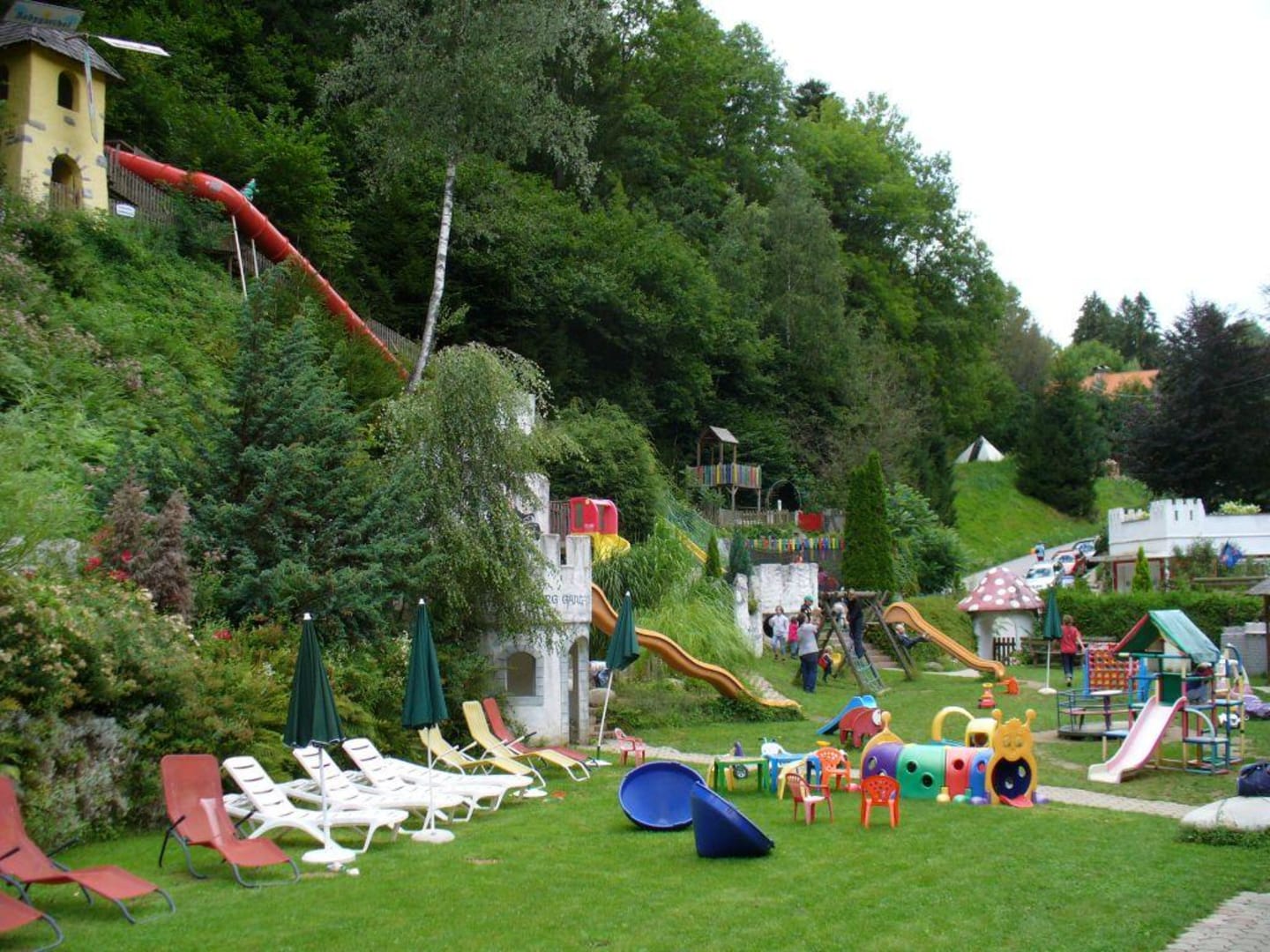 Blick von unten, Spielplatz geht bis in den Wald hinein, alles gesichert