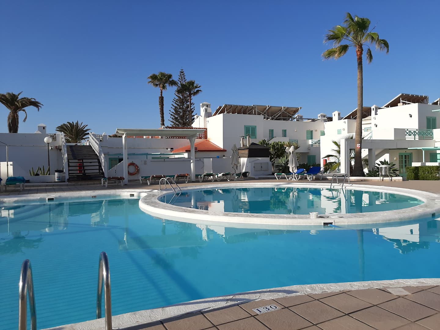 Tags am Pool mit blick auf die Brücke die zur Terasse führt wo Liegen zur Verfügung stehen