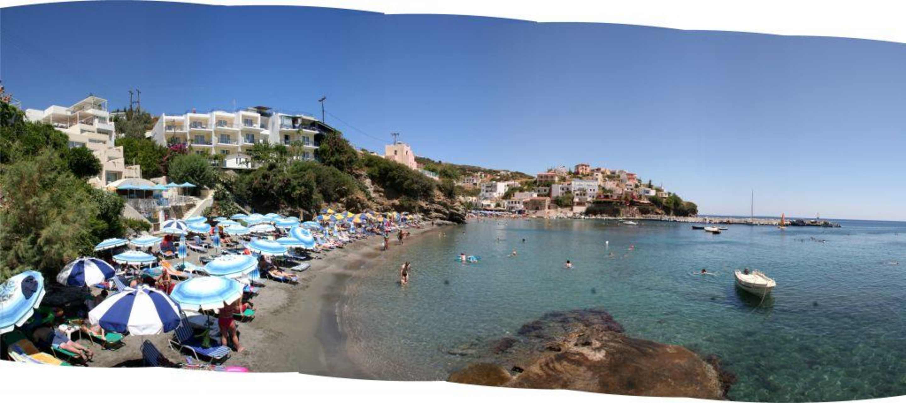 Strand zu Hotel Mythos BeachIn der Bildmitte das Hotel Mythos Beach.