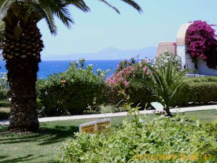 Blick von Garten / Bungalow / Pool auf Meer