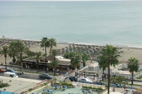 Blick zum Strand von einer Poolterrasse