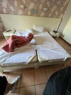 Doppelbett mit durchgelegenen Matratzen ohne Topper und großer Ritze.