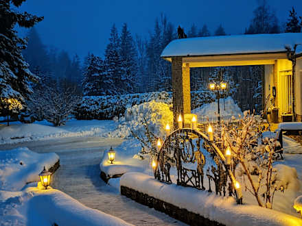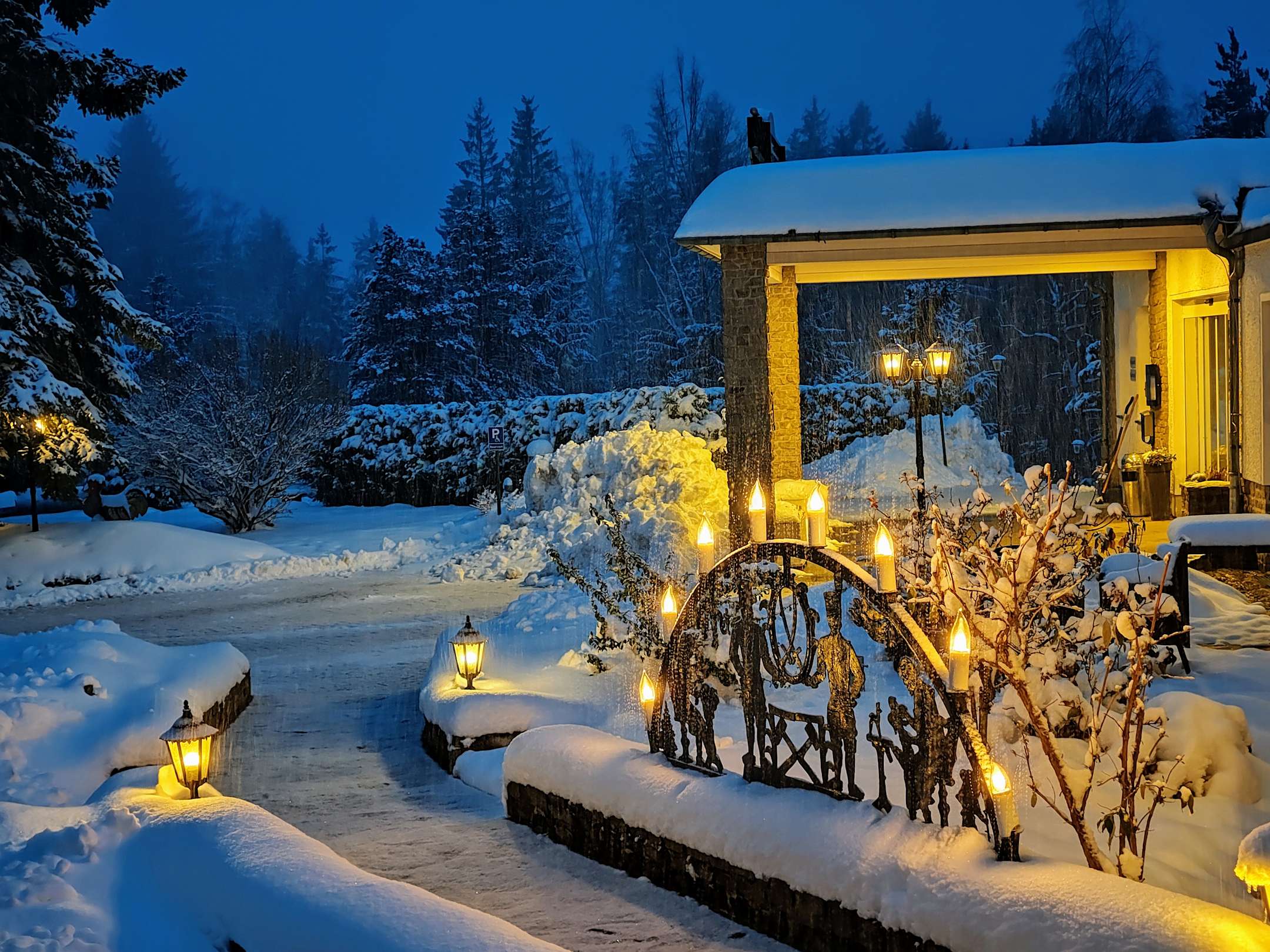 Blick aus Zimmer auf Hotel-Eingang mit viel Neuschnee am 28.11.2023