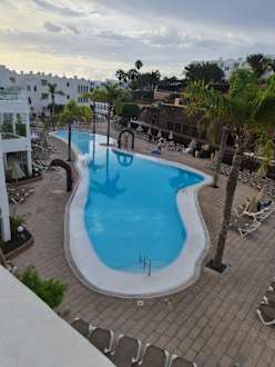 Pool am Morgen von Balkon Zimmer 40F aus.