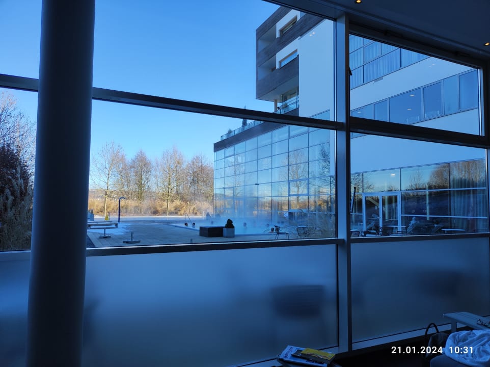 Blick v. Saunabereich zu den Außenpools