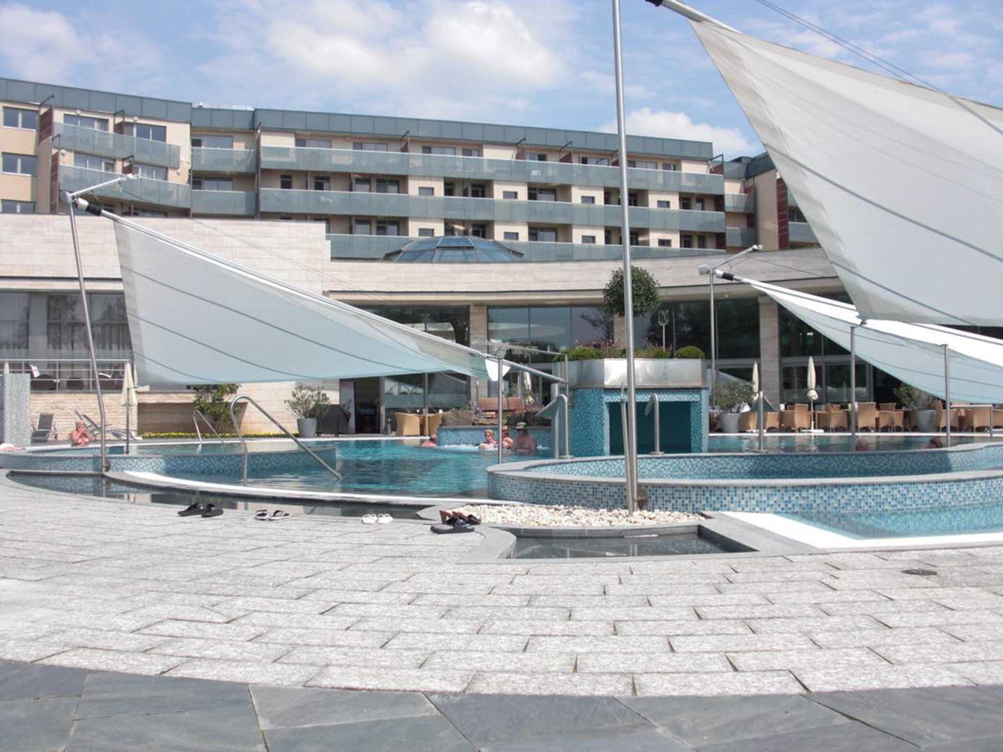 Ein Blick von den Liegen aus über einen der Aussenpools auf die Hotelanlage.