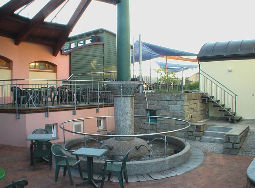 Aussenterrasse des Restaurants und Brunnen