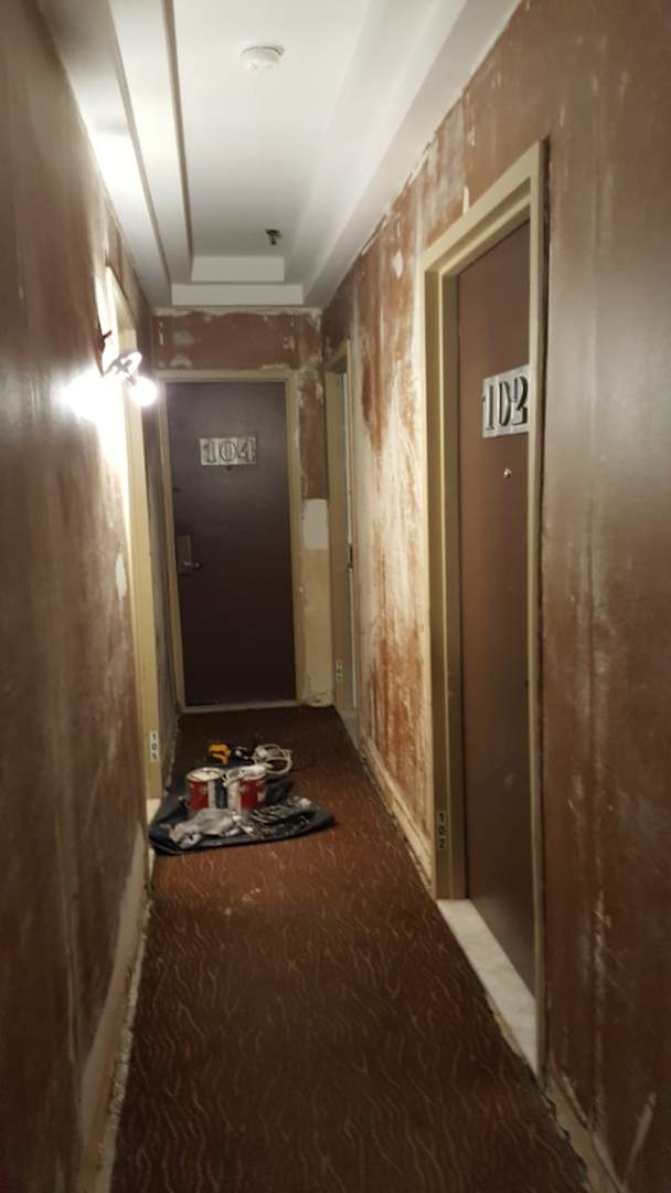 Gang, mit Farbdosen etc. ohne Tapeten... loses Mauerwerk