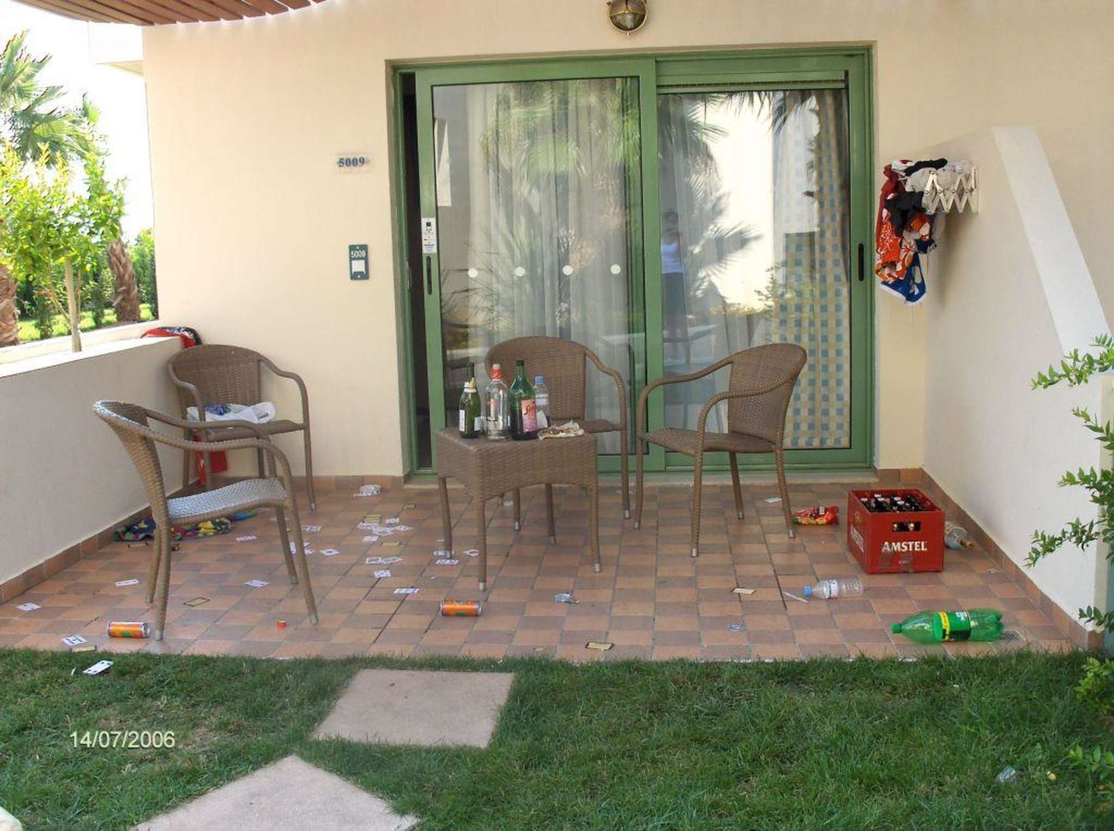 Schmutzige Terrasse von den Party-Nachbarn