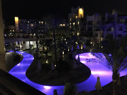 Nachtansicht des beleuchteten Pools.