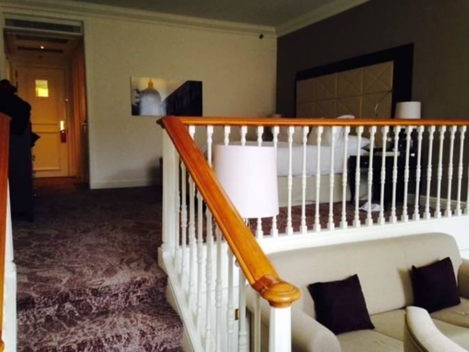 View of bed from sunken living area