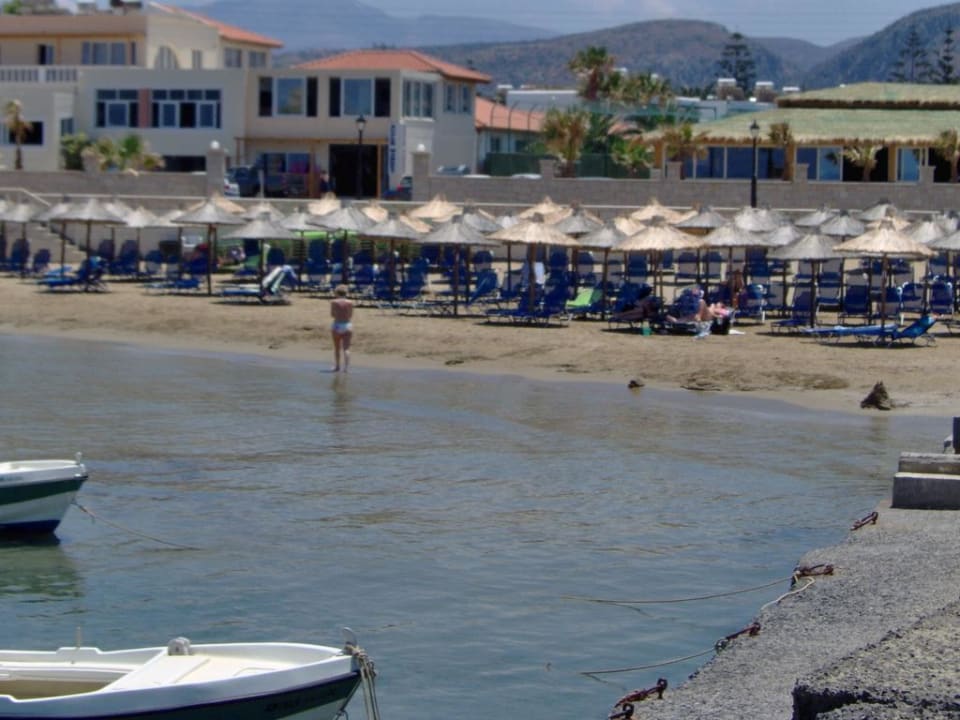 Kleiner Hotelstrand mit Liegen und Schirmen