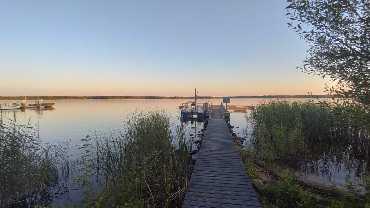 Blick Richtung Senftenberger See und Bootssteg des Hotels