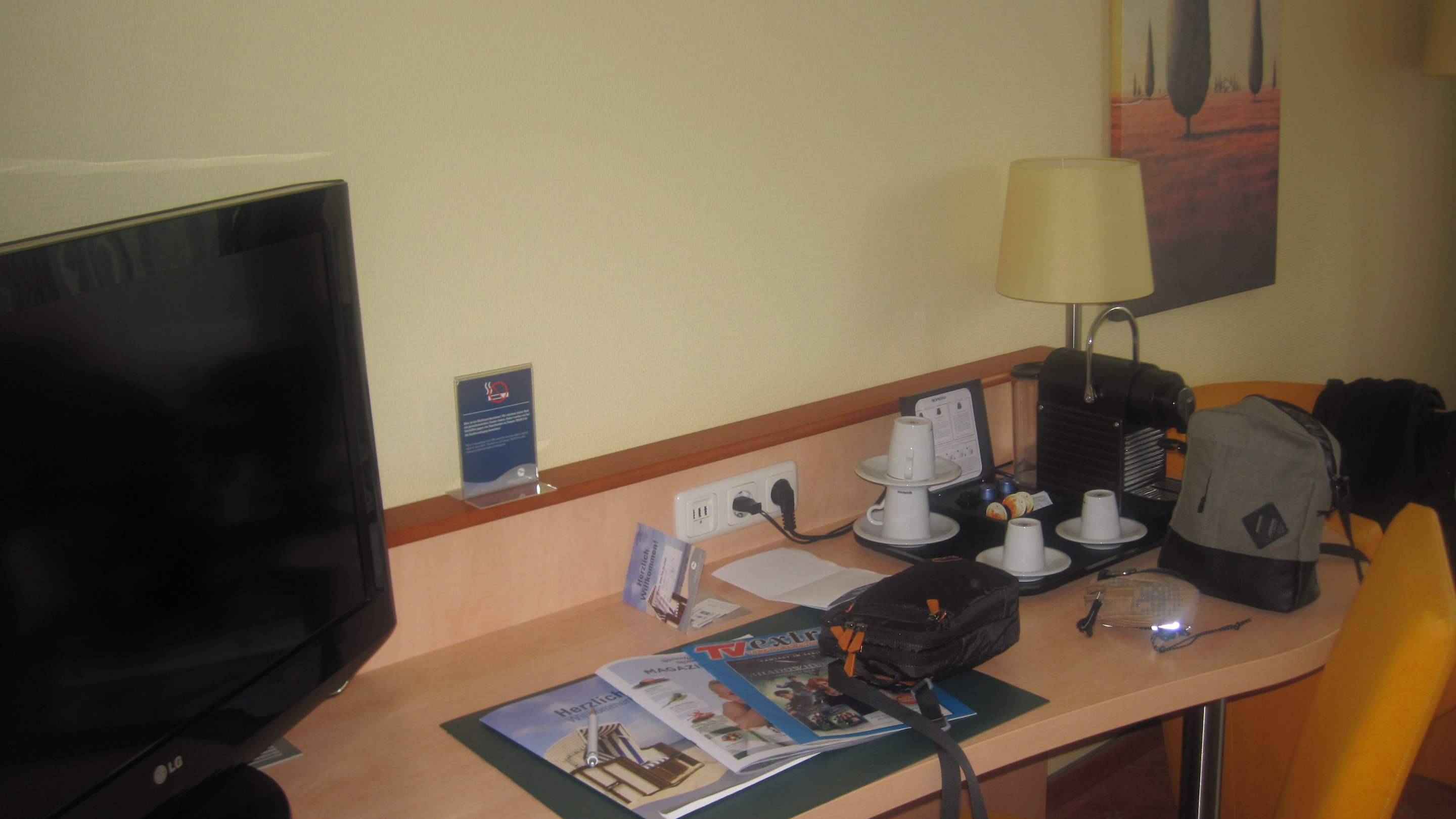 Im Zimmer ein vorhandener Schreibtisch und Fernseher inklusive der Nespressomaschine.