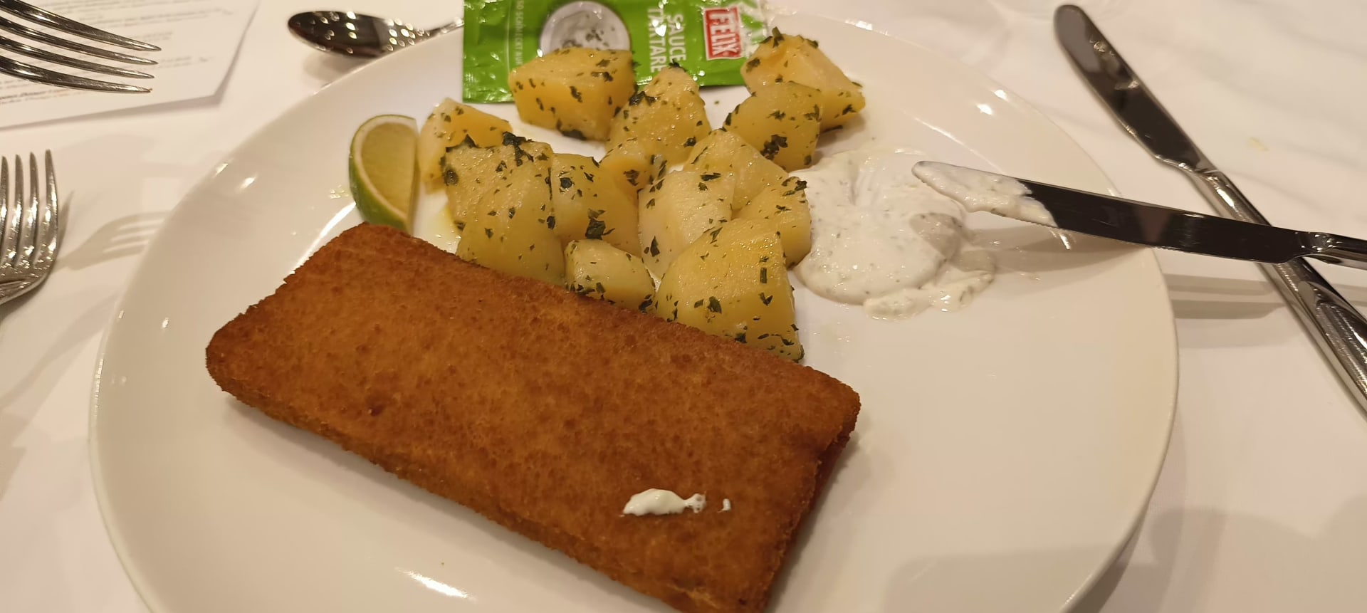 4-Sterne a La Cars: Hier gibt es den panierten Fisch schon mal frittiert mit Sauce aus der Plastiktüte! So etwas habe ich in Österreich noch nie erlebt. Das gibt's bei Strass zum 4-Sterne Preis genauso wie eine 0,5l-Apfelschorle für 7,- €.