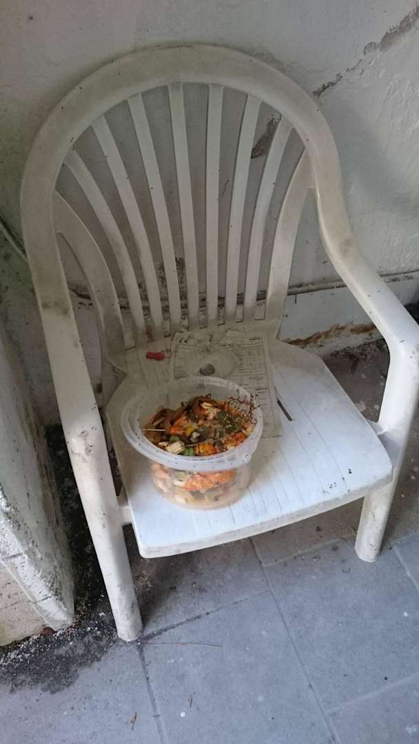 Eimer mit Essensresten und Fliegen