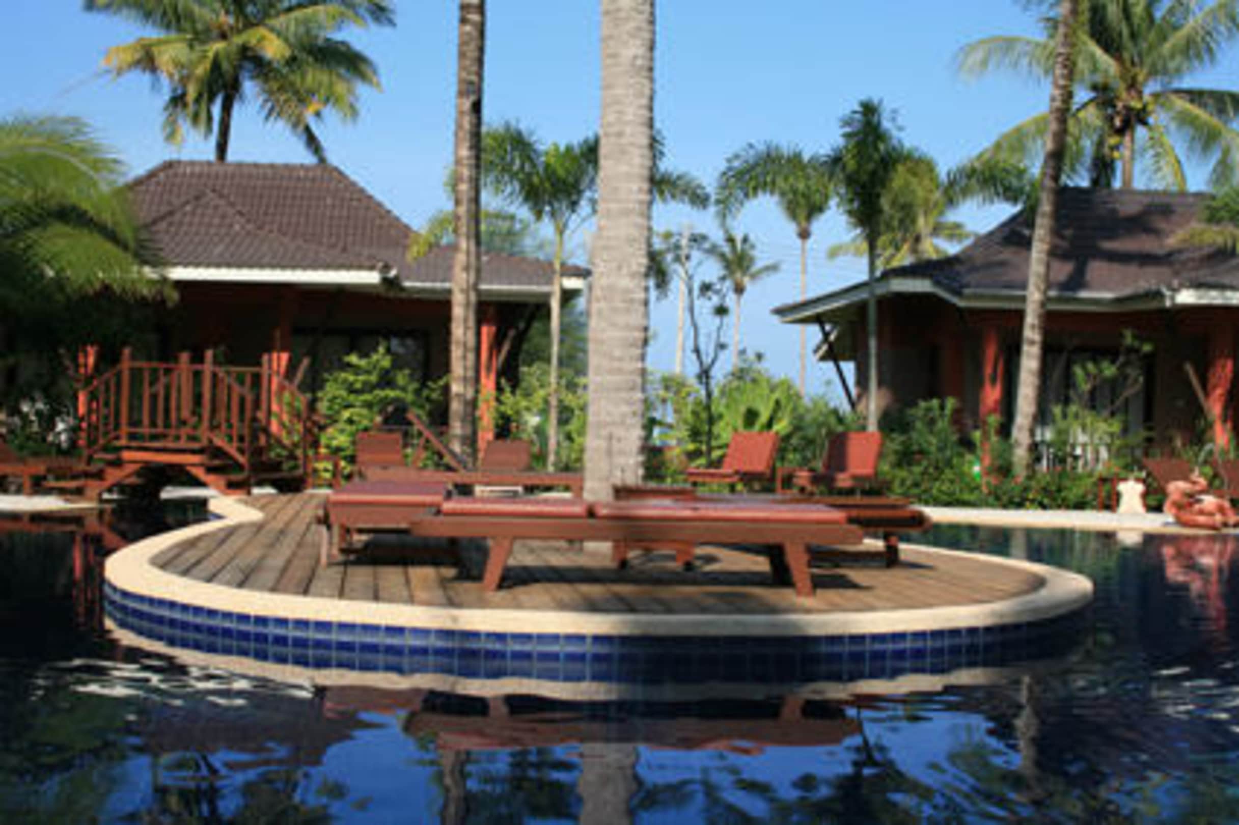 Pool, im Hintergrund die Bungalows