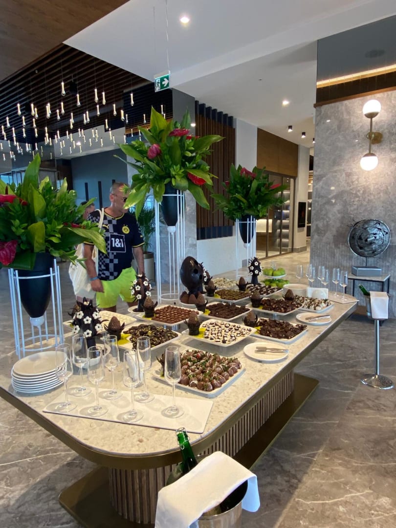 Beim Empfang gab es hausgemachte Pralinen mit Sekt und leckeren Erdbeeren mit weißer oder dunkler Schokolade!