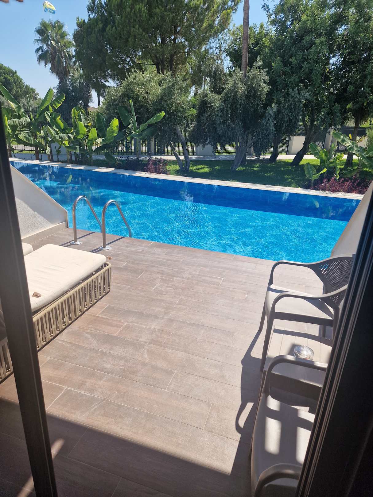 SwimUp Zimmer im Nebengebäude. Einstieg ohne Stufe! Liege und Sitzmöglichkeit vorhanden. Wassertiefe 1,40m