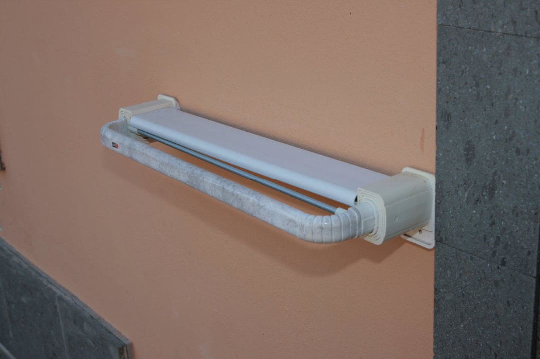 Völlig versiffter und defekter Handtuchtrockner an der Außenfassade des Bungalows