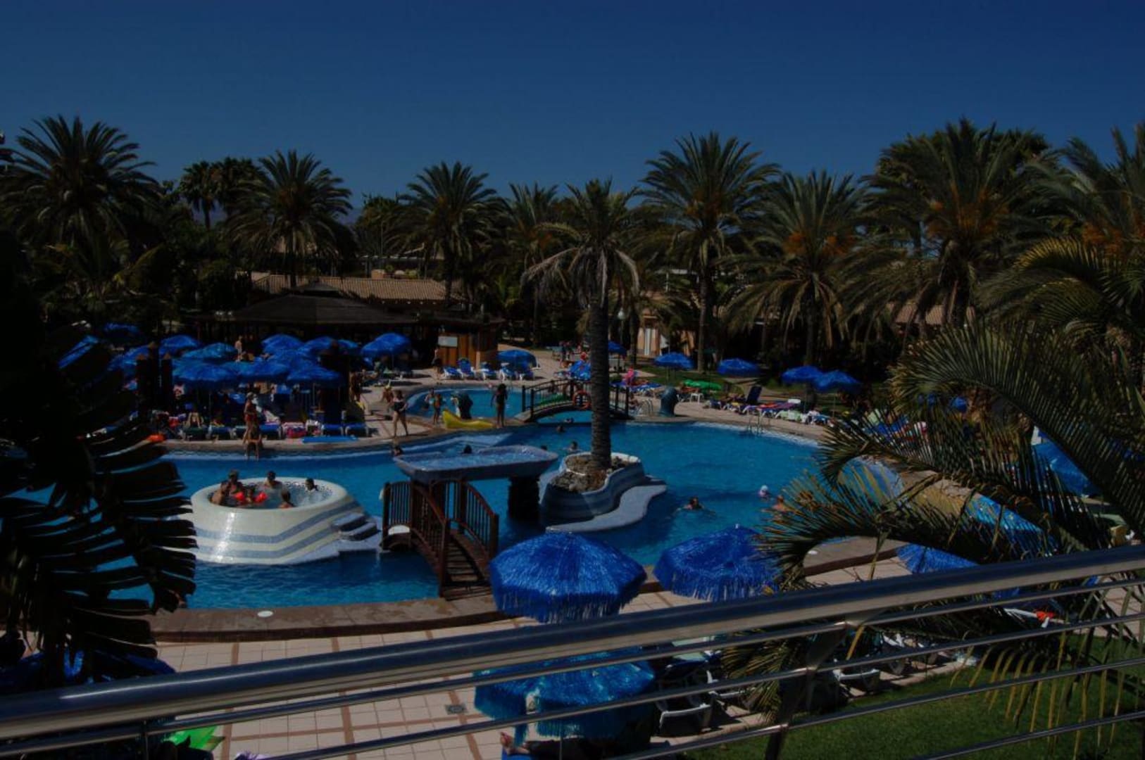 von der oberen Ebene *im Rücken die Rezeption* Blick auf den Hauptpool mit der Poolbar. Unter dem Standpunkt ist das Restaurant und die Abendbar/Discothek. Im weiteren Hintergrund dann die weitläufige Anlage.