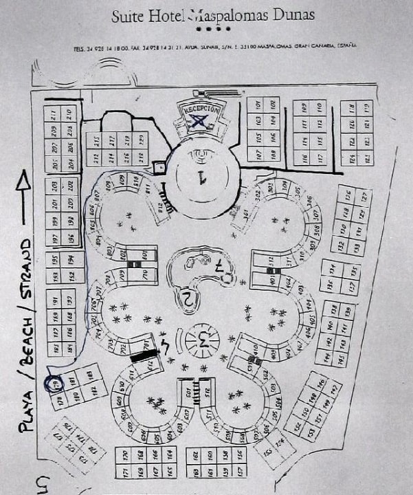 Vor der 1. liegt die Rezeption. Die 1. ist ein Innenhof mit Bar und Bühne für die Shows am Abend. 2. und 7. sind der Pool. 3. ist die Poolbar. Die kleinen Nummern in den Rechtecken sind natürlich die Suiten. Die in den kreisbögen liegen auf der Ebene des Pools, die am Bildrand liegen eine Ebene höher.